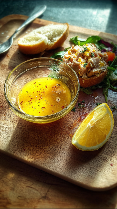 - Dijon mustard: A good Dijon adds both creaminess and complexity. It acts as an emulsifier that helps bind the oil and lemon juice together while contributing its distinctive tangy flavor.